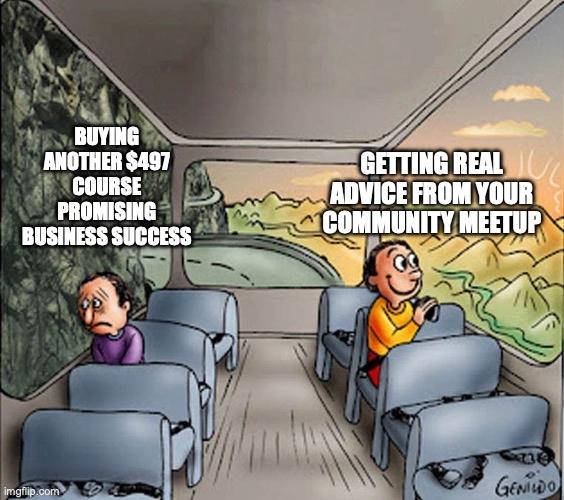 Take my experience with Rippl. At a Boston Builders meetup, a friend suggested pivoting from product to service. That's contextual advice I'd never get from a course selling universal frameworks.